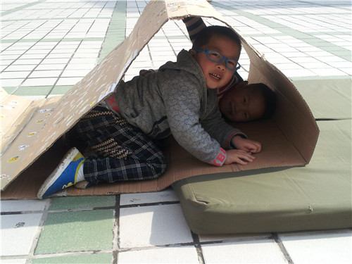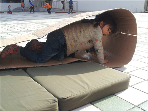最近我们广化幼儿园中一班多了一样晨间器械,叫做车轮滚滚。晨间户外锻炼时,孩子们都排队等着玩这个玩具,兴趣极高。其实它的材料很简单,就是家长带来的一个大纸板箱。老师把箱子糊了起来,小朋们又在箱子上贴上了好看的贴花纸,一件晨间器械瞬间就完成了。