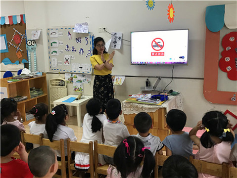 首先,教师利用多媒体课件、图片、故事、儿歌、案例等,让幼儿了解易发生溺水事故的危险地带,分析如何避免溺水。认识防溺水的标志和如何预防溺水及溺水救护方法等各类安全知识。最后围绕一系列问题,幼儿互相交流,积极讨论,清晰的表达自己的观点,对防溺水知识有了更进一步的认识与理解。