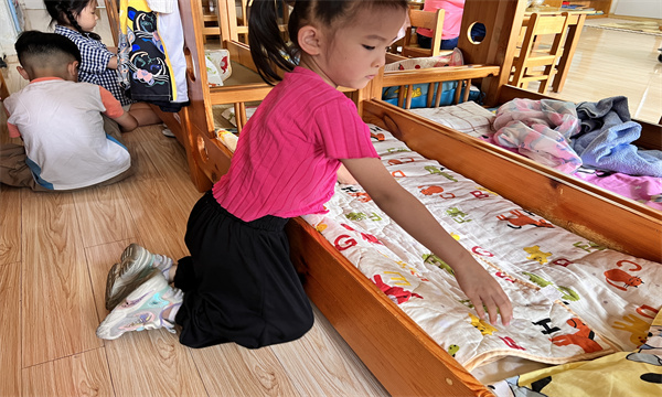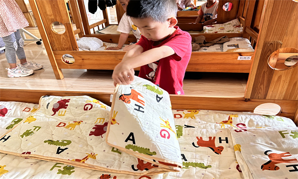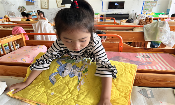 通过这样一次简单有趣的活动,孩子们不仅学会了叠被子这项技能,发展了动手操作能力,更体会到了老师阿姨以及家人们劳动的不易,提高了自主服务意识和能力。幼儿在活动中得到了锻炼,也进一步提高了生活自理能力,增强了竞争意识,为养成良好的学习生活习惯打下了坚实的基础。(撰写:朱旻晨/审核:虞静)