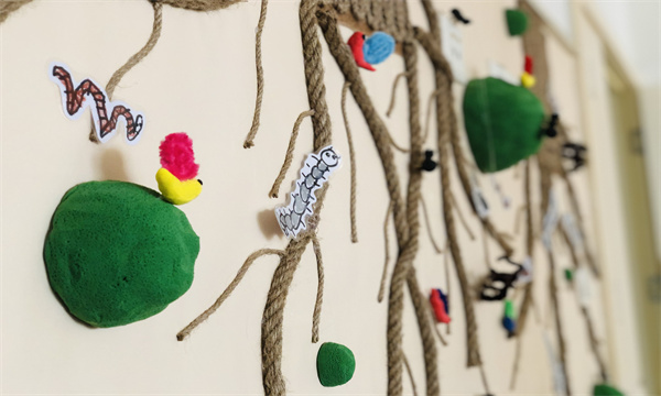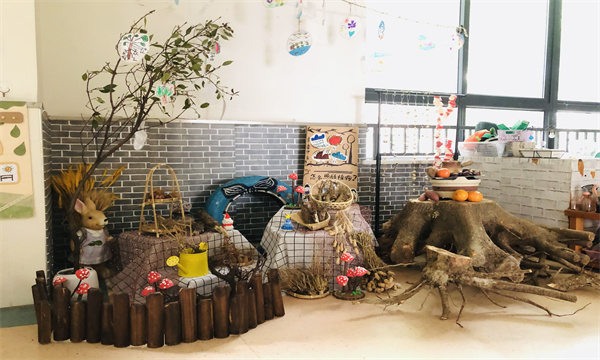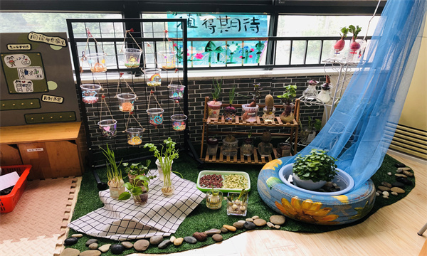 我们利用得天独厚的自然资源,在教室的角落、立柱、墙面等创设关于根的小景,皆在营造美的环境。同时,创设两处“干湿分离”自然角——走廊的根系展示和教室的水培种植,以不同的展现方式,让孩子们发现、感受、欣赏根系的美。同时凸显根在生活中的利用,将最大的树根作为围炉煮茶的摆台,让孩子们知道原来大树根还可以作为家具来使用。