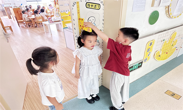 活动伊始,孩子们在老师的引导下,两两一组化身“小小测量员”。他们手握软尺,互相帮忙测量身高,将数据认真记录在“成长手册”上。“你看,我到刻度线这里了,真的长高啦!”孩子们一边对比小班时的身高记录,一边兴奋地和同伴分享发现,稚嫩的脸庞上满是自豪。
