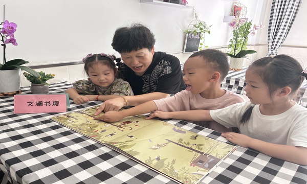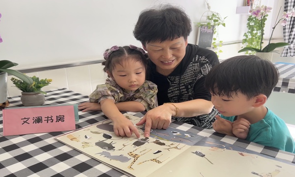 在幼儿阅读区,柔软的地垫上散落着色彩斑斓的绘本,老教师们正用夸张的语调与生动的手势演绎故事。退休返聘的虞老师手持《该回家了,小淘气》,引导孩子们用动作展示动物的特征,还不时俯身回应孩子们的奇思妙想,孩子们或依偎在老师身旁专注倾听,或指着画面互相交流,书房里的温馨氛围让阅读成为情感联结的纽带。