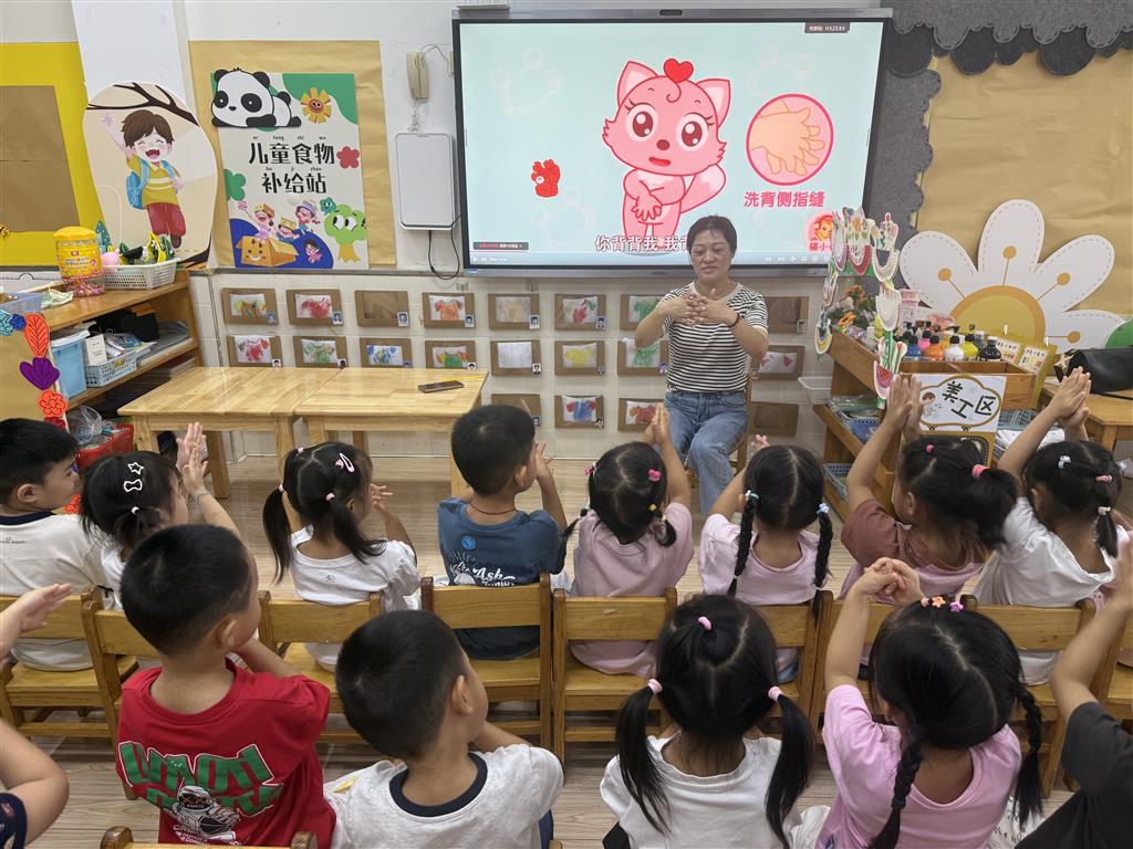 活动中,老师借助大屏展示的“七步洗手法”步骤图示,生动形象地讲解每一步的动作要领。小班幼儿们兴致勃勃,紧紧跟着老师的示范,认真模仿“内、外、夹、弓、大、立、腕”的洗手步骤,一双双小手在模仿中反复练习,逐渐掌握了正确的洗手方法。