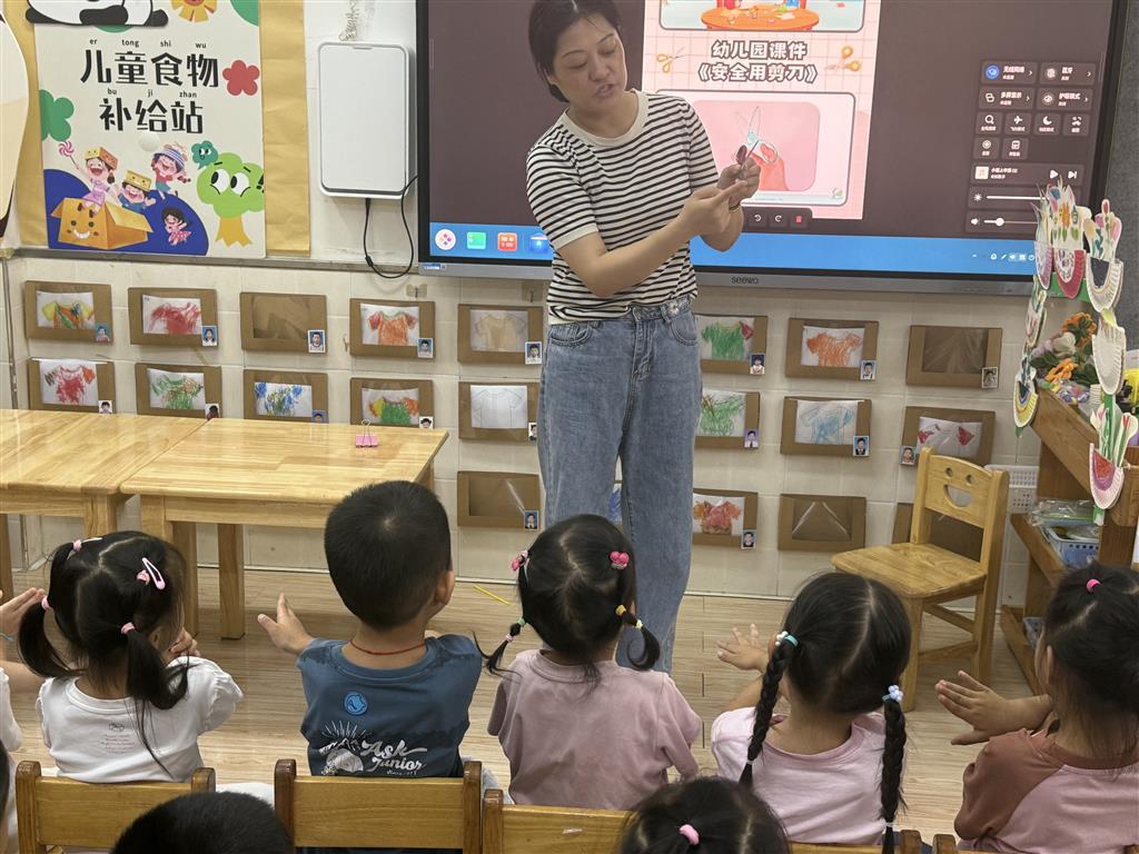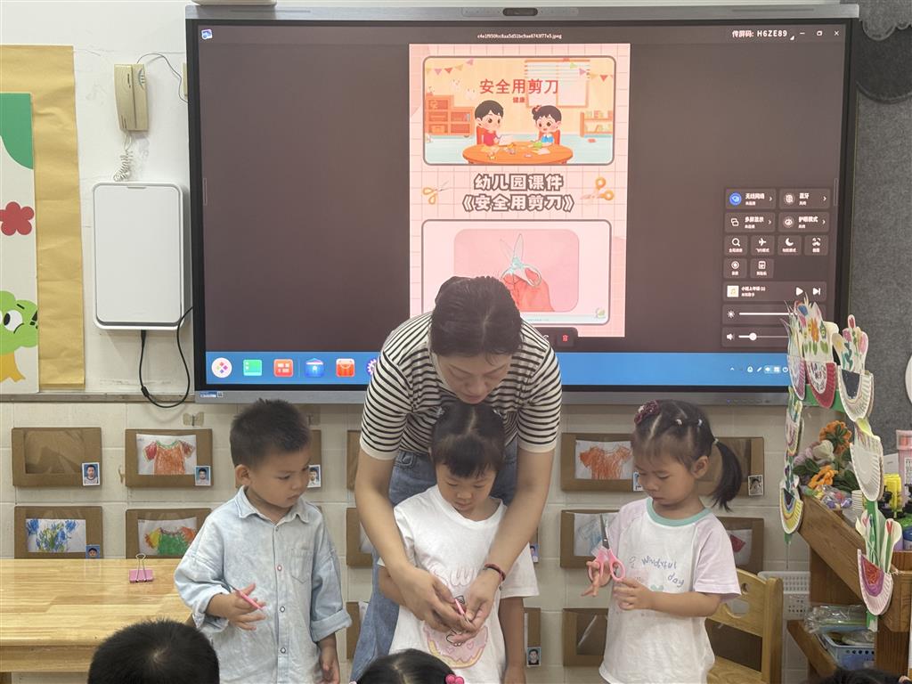 活动中,教师借助生动的多媒体课件,向幼儿展示了剪刀使用的安全注意事项,通过卡通画面和直观的示意图,让幼儿初步了解在使用剪刀时不能随意挥舞、不能对着自己和他人等基本安全规则。