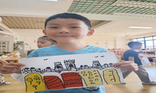 “长城像一条巨龙!”“它爬到了高高的山上!”在了解了长城的基本样貌后,小画家们迫不及待地拿起画笔,投入创作。他们俯身在长长的画纸上,用稚嫩却坚定的笔触勾勒出长城的蜿蜒曲折。有的用厚重的砖红色涂出坚实的城墙,有的用翠绿色点缀山峦,还有的发挥奇思妙想,在天空画上了彩虹、太阳和飞翔的小鸟。不一会儿,一幅充满童真与想象力的“万里长城图”便跃然纸上,每一笔每一画都凝聚着孩子们对祖国壮丽河山的无限向往与自豪。