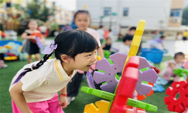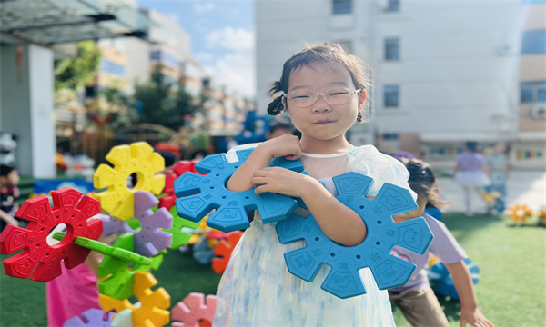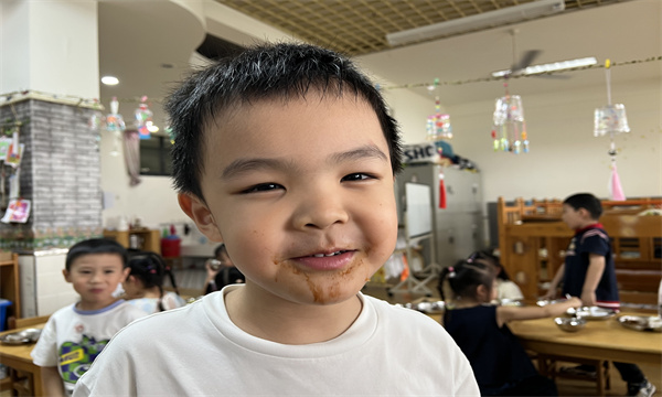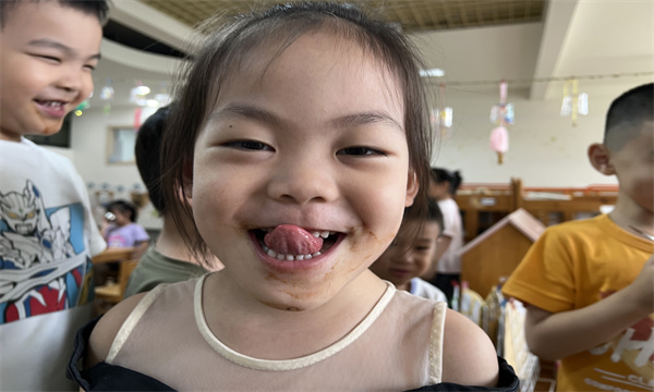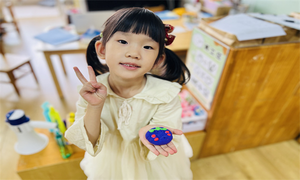 在户外搭建区,孩子们用积木搭建"未来城堡"时,番茄对着塔楼对面的同伴兴奋大笑,教师迅速按下快门;室内手工课上,小洁成功完成黏土重阳糕作品后,仰起小脸露出灿烂笑容,这一画面被定格成特写;午餐时间,平时孩子们拿着吃光的餐盘,抬起满嘴酱汁的笑脸,老师为他们竖起大拇指的瞬间也被收录进相册。
