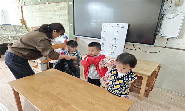 小班宝宝刚入园不久,多数依赖家长帮助穿衣,自理能力有待提升。为培养孩子们的独立意识,小三班教师结合幼儿认知特点,设计了分层教学活动。课堂上,教师先用玩偶演示穿衣步骤,将“穿袖子”比作“钻洞子”用童趣语言化解学习难点;随后分组开展实践练习,对动作较慢的孩子手把手指导,及时用“你穿衣服速度真快”“衣服穿得真整齐”等话语鼓励。