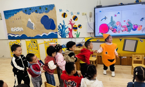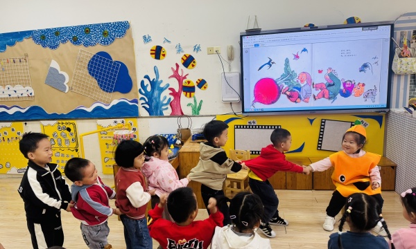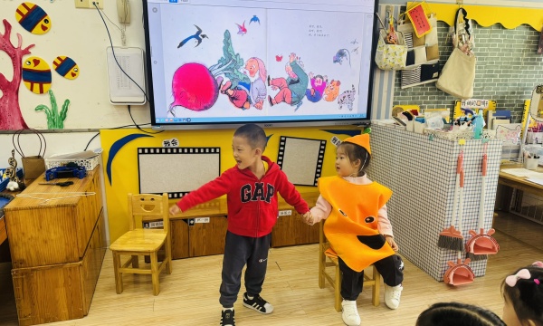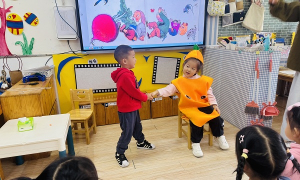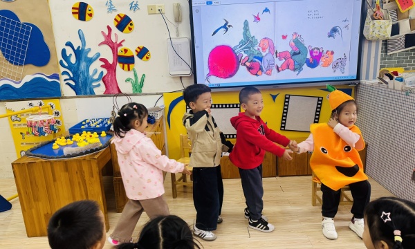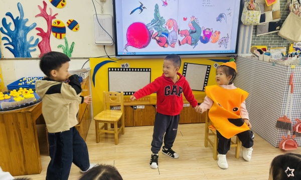 小班宝贝们刚适应集体生活不久,正处在社交与协作意识的萌芽阶段。为了让孩子们在游戏中理解“团结”的意义,小一班教师结合经典绘本《拔萝卜》的故事,设计了这场趣味戏剧活动:先通过大屏幕展示绘本画面,用生动的角色对话引导宝贝们感知情节;随后邀请孩子扮演“萝卜”“老爷爷”“小动物”等角色,用拉手“拔河”的形式还原“众人拔萝卜”的场景。