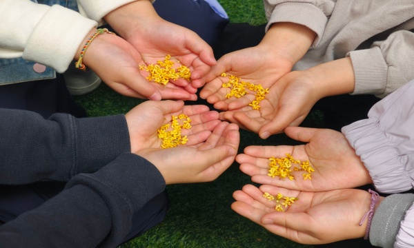 “老师你看,这桂花好香!”“这片叶子像小扇子!”秋日的幼儿园草坪上,大班孩子们的欢笑声裹着桂花香散开。