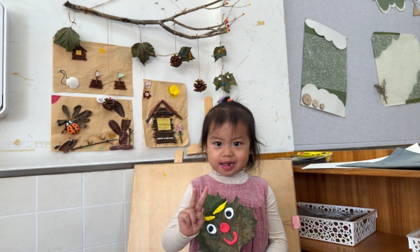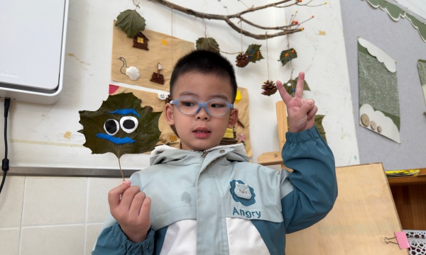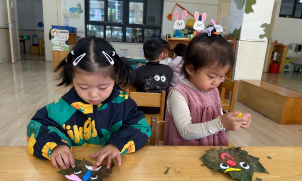 活动现场被精心营造成秋日童话秘境:干枯树枝被巧妙悬挂于墙面,缀满形态各异的秋叶与棕褐松果,仿佛将郊外秋景悄然搬入室内,宛如一座充满童趣的“微型自然艺术展馆”。孩子们化身“自然艺术设计师”,手持精心甄选的秋叶,辅以彩泥、小饰件等“创意工具”,让平凡的自然素材焕发出别样生机:有的树叶被赋予圆溜溜的眼睛与红扑扑的鼻头,化身憨态可掬的“树叶精灵”;有的则被塑造成带着俏皮“凶相”的“树叶小怪兽”……每一件作品都刻画得栩栩如生,满溢着孩童独有的奇思妙想。