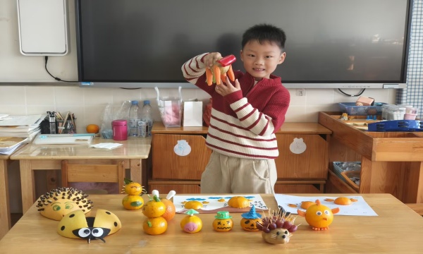 最有意思的是杨立语,他举着自己的“土豆鸵鸟”满教室跑,嘴里念叨着“鸵鸟要去沙漠啦”;焦书桐则把榴莲壳装饰成了“小刺猬”,彩色毛球粘在壳上,活像刺猬的尖刺。就连平时有点腼腆的刘芸希,也举着自己做的“橘子灯笼”,小声跟同桌分享:“这个‘灯笼’会发光哦!”