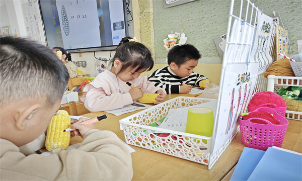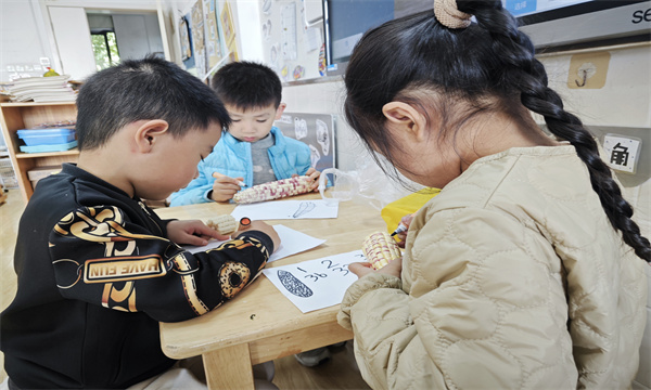 活动现场,金黄的玉米粒、粗糙的玉米皮瞬间点燃了大家的探索热情。“我的玉米上有多少颗玉米粒呀?”“它和你的比谁的更多?”带着疑问,孩子们小心翼翼地剥下玉米粒,有的两两一组合作计数,有的用画圈、画竖线的方式记录数量,还有的主动向老师请教统计方法。遇到玉米粒粘连、计数出错的情况,孩子们相互帮忙、反复核对,在实践中掌握了“一个对应一个”的计数技巧,学会了用简单符号进行数据记录。