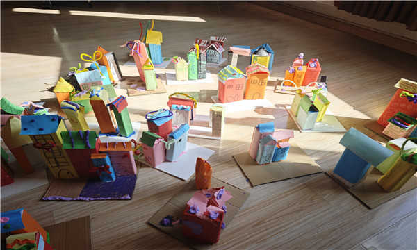 活动的重头戏是“共建纸盒童话镇”亲子手工环节。在党员教师的引导下,各组家庭利用提前收集的废旧纸盒、瓶罐等材料,开始了奇妙的创作之旅。平日里看似无用的牛奶盒、牙膏盒,在家长和孩子们的巧手合作下,被赋予了新的生命。剪裁、拼贴、涂画、装饰……一个个不起眼的纸箱纸盒,神奇地变身为高矮错落、色彩斑斓的童话小屋。整个过程中,党员教师们穿梭其间,耐心指导,鼓励创新,并时刻提醒安全注意事项,充分体现了党员的服务意识与专业素养。