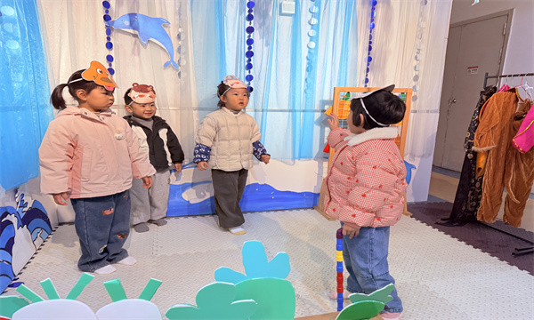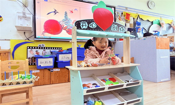 最受孩子们欢迎的当属 “故事剧场” 环节。教师为孩子们准备了可爱的手偶、头饰等道具,鼓励大家自主选择喜欢的角色演绎故事。“老爷爷” 弯着腰努力拔萝卜,“老奶奶” 拄着 “拐杖” 前来帮忙,“小狗” 摇着尾巴加入队伍…… 孩子们模仿着角色的动作和语气,沉浸式投入表演,现场笑声不断。在互动演绎中,孩子们不仅加深了对故事角色和情节的理解,还大胆表达自己,提升了语言表达能力和合作意识。
