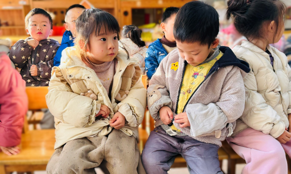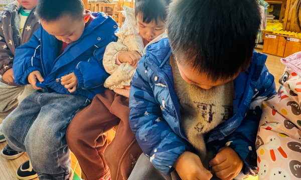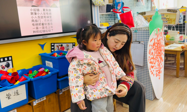 好的拉链,笑得露出了小虎牙;有的转身和小伙伴分享自己的成果,叽叽喳喳地说着