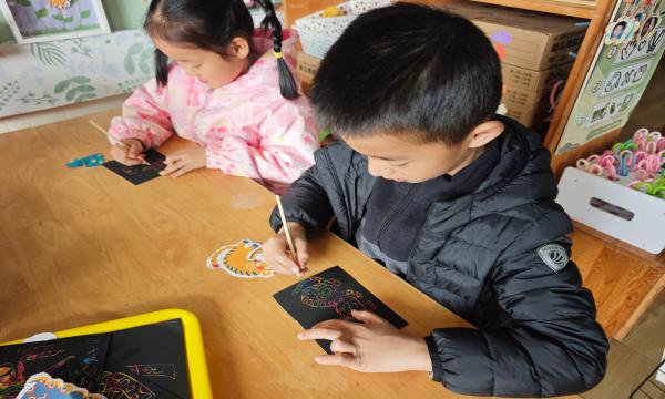 刻画区的桌面上,木板、安全刻刀、颜料整齐摆放。老师引导幼儿观察生肖的外形特征,鼓励大家大胆设计图案。孩子们专注地在木板上勾勒、刻画,再用五彩颜料涂色,一个个栩栩如生的生肖刻画作品逐渐成型,展现出无限创造力。