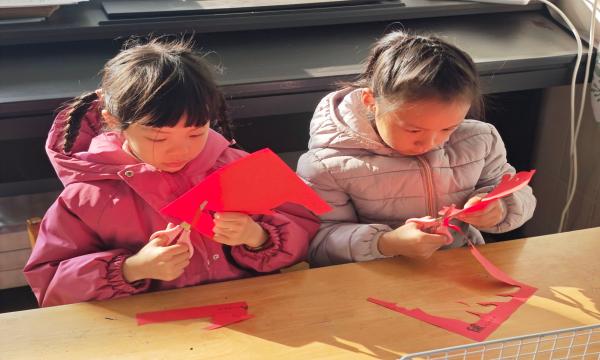 活动现场暖意融融,充满欢声笑语。剪纸区里,老师先通过趣味绘本讲述十二生肖的传说故事,随后示范折、剪、挖、刻的基本技巧。孩子们手持安全剪刀,在彩纸上认真勾勒生肖轮廓,小心翼翼地裁剪。有的剪出威风凛凛的老虎,有的裁出灵动可爱的兔子,虽然线条略显稚嫩,但每一件作品都充满童真童趣。