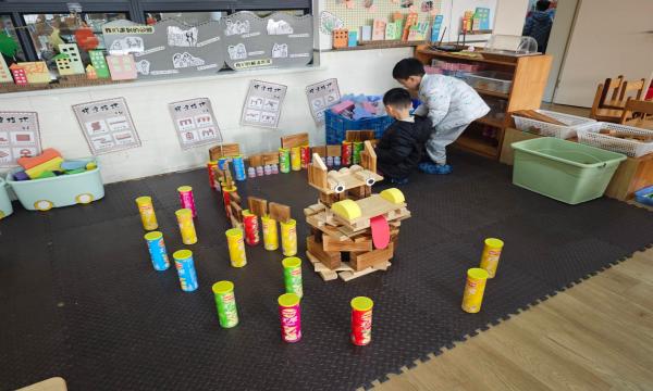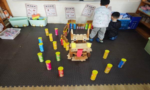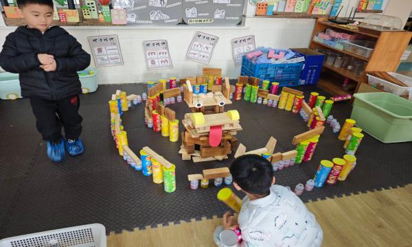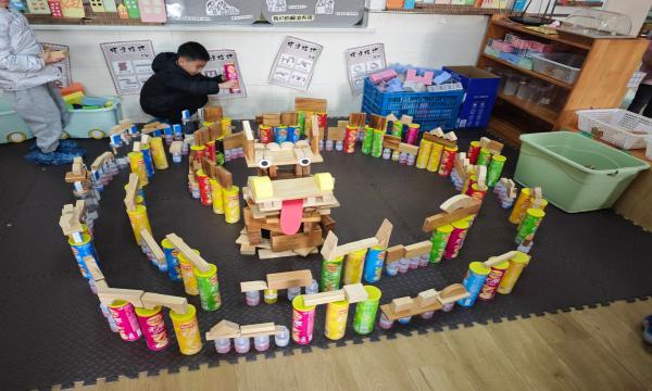 现场,积木、纸盒、易拉罐、卷纸筒等丰富材料整齐摆放,孩子们化身 “小小建筑师”,分工协作、有条不紊。有的小组用大型空心积木搭建龙头框架,再用彩色小积木拼接出炯炯有神的眼睛和翘起的犄角;有的小组将长方体积木层层叠加,搭建出蜿蜒舒展的龙身,还巧妙利用弧形积木模拟龙的鳞片;还有的小组用易拉罐支撑龙尾,搭配闪亮的串珠和彩绳装饰,让龙显得愈发灵动。搭建过程中,遇到龙身不稳、零件掉落等问题,孩子们主动沟通、互相帮忙,在协作中解决困难,充分展现了团队精神。