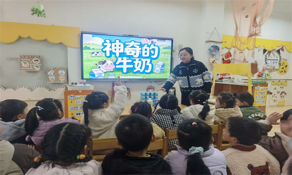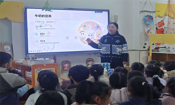 课堂上,家长老师以趣味提问“我们喝的牛奶从哪里来?”点燃孩子们的好奇心,随后借助精美图片和动画,生动讲述了奶牛从吃草、挤奶到牛奶经杀菌、过滤、包装的完整旅程,让孩子们了解到每一杯牛奶都来之不易。在营养科普环节,家长老师用通俗的语言介绍了牛奶中富含的蛋白质、钙、维生素D等关键营养,通过“钙能让骨骼变强壮”“蛋白质帮我们长高高”等形象表述,让孩子们直观认识到牛奶对成长的重要性。互动问答环节中,孩子们踊跃举手、积极分享,课堂气氛热烈而温馨。