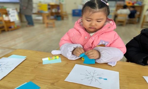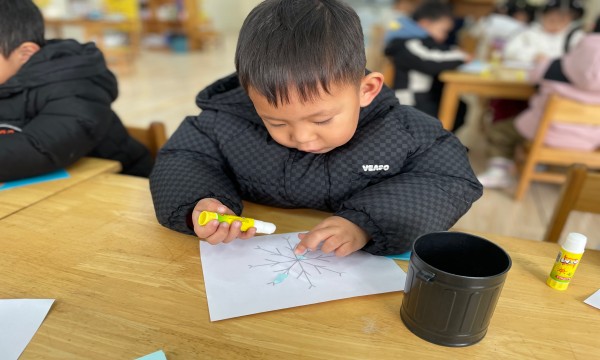 活动中,孩子们的小手忙个不停:先拿起蓝色彩纸,手指捏着纸边轻轻撕出大小不一的纸片。有的撕出圆润的“花瓣形”,有的撕出细长的“冰晶条”,连偶尔撕得歪歪扭扭的碎纸,也被当成独特的雪花碎片收在手心;接着拿起胶棒,涂在印有雪花轮廓的画纸上,再把撕好的纸片一一贴在轮廓枝桠上。