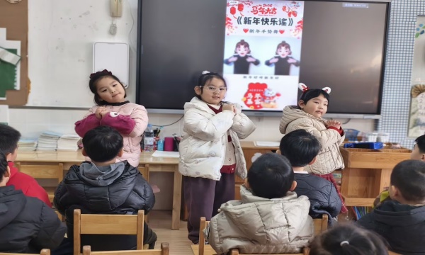 在欢快的《新年快乐谣》音乐声中,孩子们化身“小小舞蹈家”,跟着屏幕里的手势舞视频认真学习。教室里洋溢着满满的喜庆气息。