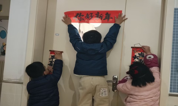 最后,孩子们拿着春联和挂饰,一起动手装扮教室。把红彤彤的春联贴在门上,让整个教室焕然一新。