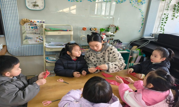 剪纸环节里,老师耐心教孩子们对折红纸、画纹样、剪轮廓。在一双双小手的精心操作下,普通的红纸变成了一幅幅带着吉祥寓意的窗花。孩子们看着自己的作品,脸上都露出了自豪的笑容,真切体验到了传统手工的乐趣。