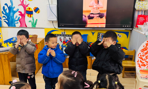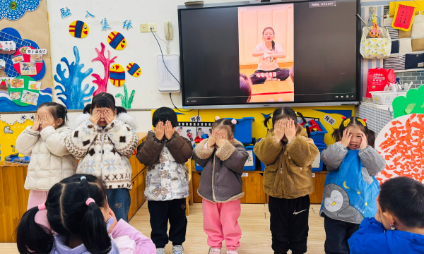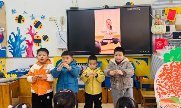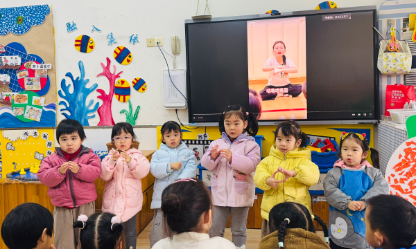 在欢快的《咕哒咕哒》音乐声中,孩子们化身“小小舞蹈家”,跟着屏幕里的手势视认真学习。一会儿把小手捂在脸上玩“躲猫猫”,一会儿把小手举过头顶变“小花朵”,一会儿又把小手放在胸前学“小火车”,教室里洋溢着满满的欢乐气息。