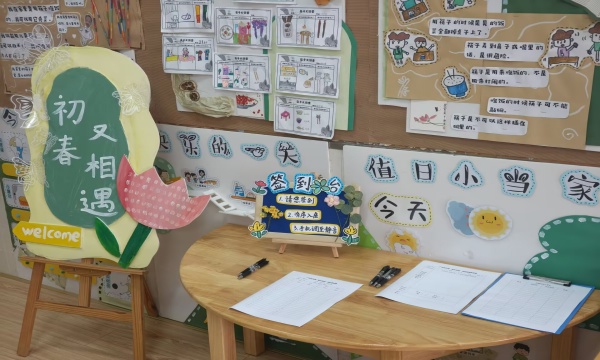 活动前,教室门口“初春又相遇”主题展板与整齐的反馈表,尽显老师的用心筹备,家长们有序签到,温馨开启家园共育之旅。