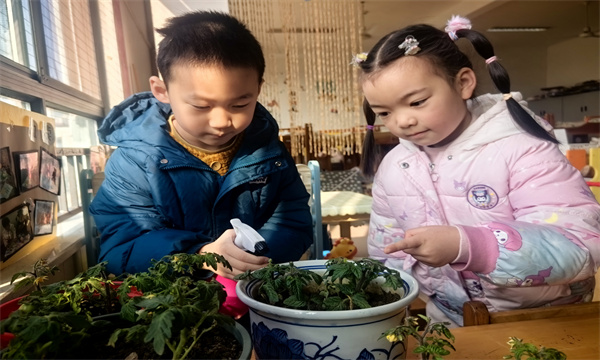 在班级的植物角里,摆满了小朋友们带来的小盆栽、小幼苗,这里成为了孩子们最喜爱的“自然小课堂”。大家化身小小护绿员,每天轮流为植物浇水、松土、擦拭叶片,用好奇的眼睛仔细观察种子发芽、叶片生长的变化,认真记录着植物的成长轨迹。孩子们轻轻抚摸嫩绿的叶子,耐心等待幼苗长高,用自己的方式精心呵护着每一株小生命,在动手实践中体会劳动的乐趣与责任。
