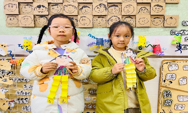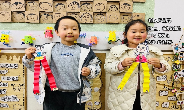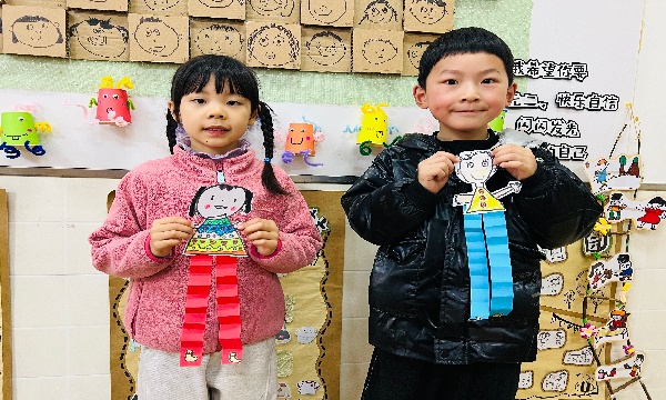 活动中,孩子们围坐在一起,拿起画笔认真勾勒自己的模样:圆圆的脸蛋、弯弯的眉毛、俏皮的发型,每一笔都充满童真与创意。在老师的引导下,他们将画好的自画像仔细剪下,再用彩色纸条折叠出富有弹性的“身体”,通过粘贴将头部与身体连接,一个个灵动的“长大的我”手工作品便跃然眼前。有的孩子为自己画上了漂亮的裙子,有的设计了帅气的外套,还有的在作品上点缀了花朵、星星等装饰,每一件作品都承载着孩子们对成长的美好憧憬。