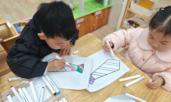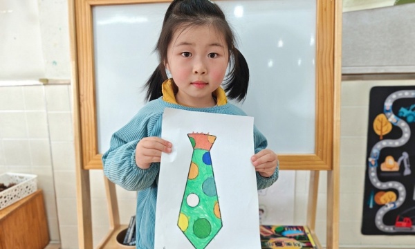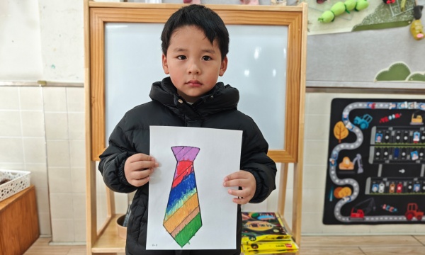 活动中,老师先通过生动的故事和图片,引导孩子们观察领带的外形特征与色彩搭配,感受领带的多样风格。随后,孩子们拿起画笔,在提前准备好的领带轮廓画纸上尽情创作。有的孩子用鲜艳的圆点装饰,有的用流畅的线条勾勒,还有的大胆搭配撞色,每一条领带都充满了童真与创意。孩子们专注涂色的模样、互相分享作品的笑脸,让整个教室洋溢着温暖的氛围。