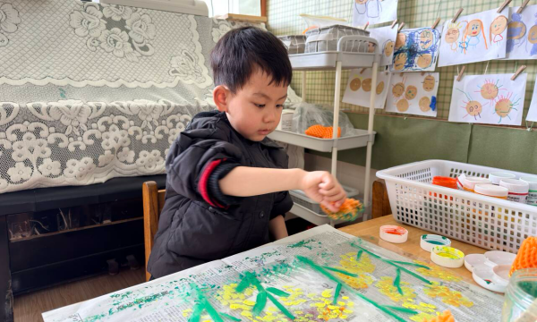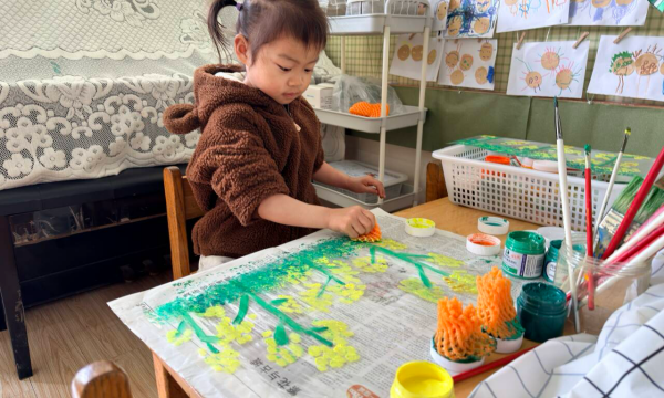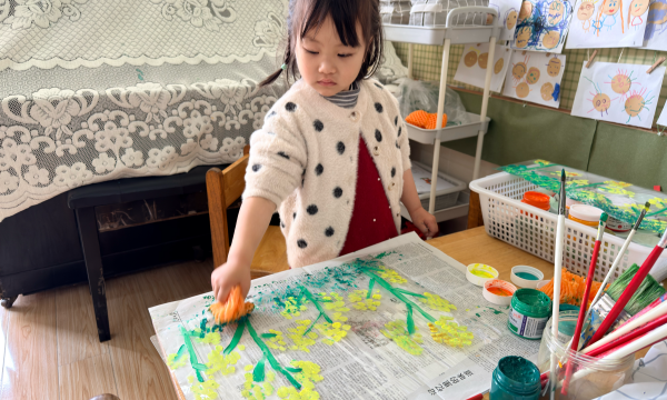 随后,孩子们拿起特制的海绵拓印工具,蘸取鲜亮的颜料,在画纸上认真地按压、点涂。稚嫩的小手虽有些笨拙,却满是专注:有的孩子先画出挺拔的花茎,再拓印出簇簇金黄的花瓣;有的孩子大胆铺色,让整片 “油菜花田” 在纸上肆意绽放。每一次按压都充满童趣,每一抹色彩都饱含对春天的喜爱,原本空白的画纸,渐渐变成了生机盎然的春日花田。