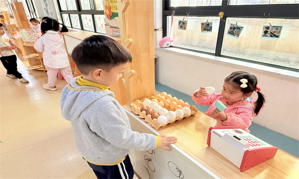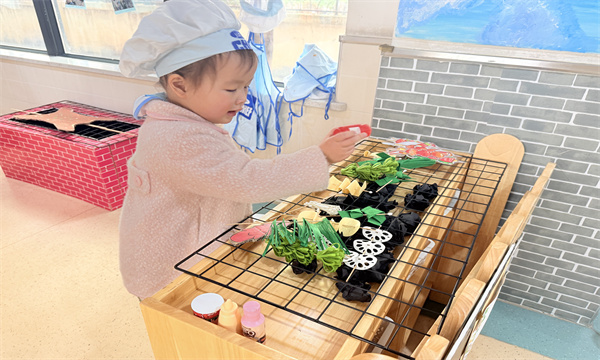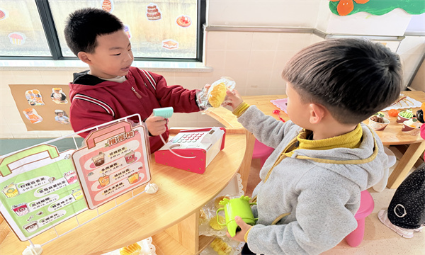 游戏过程中,孩子们完全沉浸在自己的角色里,主动分工、相互配合:有的负责“采购食材”,有的负责“烹饪美食”,有的负责“接待顾客”,还有的负责“整理店铺”。遇到“食材不够”“顾客太多”的问题时,孩子们会主动沟通、商量解决办法,在潜移默化中学会了合作与分享,也锻炼了语言表达能力。