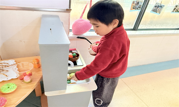 走进小班各班的娃娃家区域,仿佛置身于一个充满童趣的迷你世界:“小厨房”里,仿真锅碗瓢盆、新鲜的“食材”整齐摆放,小厨师们系上围裙、拿起锅铲,有的模仿妈妈炒菜的样子翻炒“蔬菜”,有的认真“清洗”食材,嘴里还念叨着“要给小客人做香喷喷的饭菜”;旁边的“甜品站”更是热闹非凡,小店员们戴着帽子,熟练地“制作”蛋糕、饼干、果汁,热情地向“顾客”介绍自己的“特色甜品”,你一言我一语,互动十分热闹。