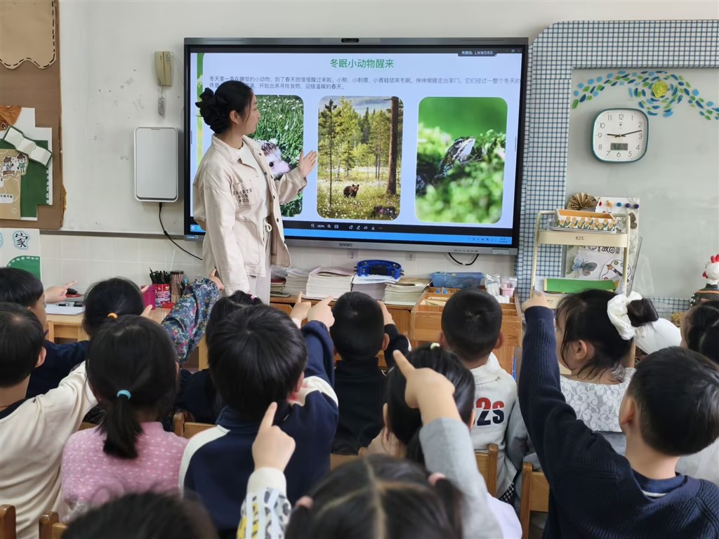 课堂上,老师以生动的课件开启春日探索之旅,带领孩子们认识“冬眠醒来的小动物”,了解春天的季节特征。孩子们睁着好奇的眼睛,踊跃举手分享自己发现的春日变化,在互动中感知春的讯息,为户外探索做好铺垫。