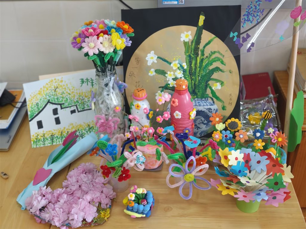 创意手工环节,孩子们将春日灵感融入创作。扭扭棒、彩纸、黏土在孩子们手中变成了一朵朵栩栩如生的春花,透明风车被绘上缤纷花影,废旧瓶罐变身创意花瓶,每一件作品都承载着孩子们对春天的独特想象,教室里处处洋溢着春日的烂漫与童趣。