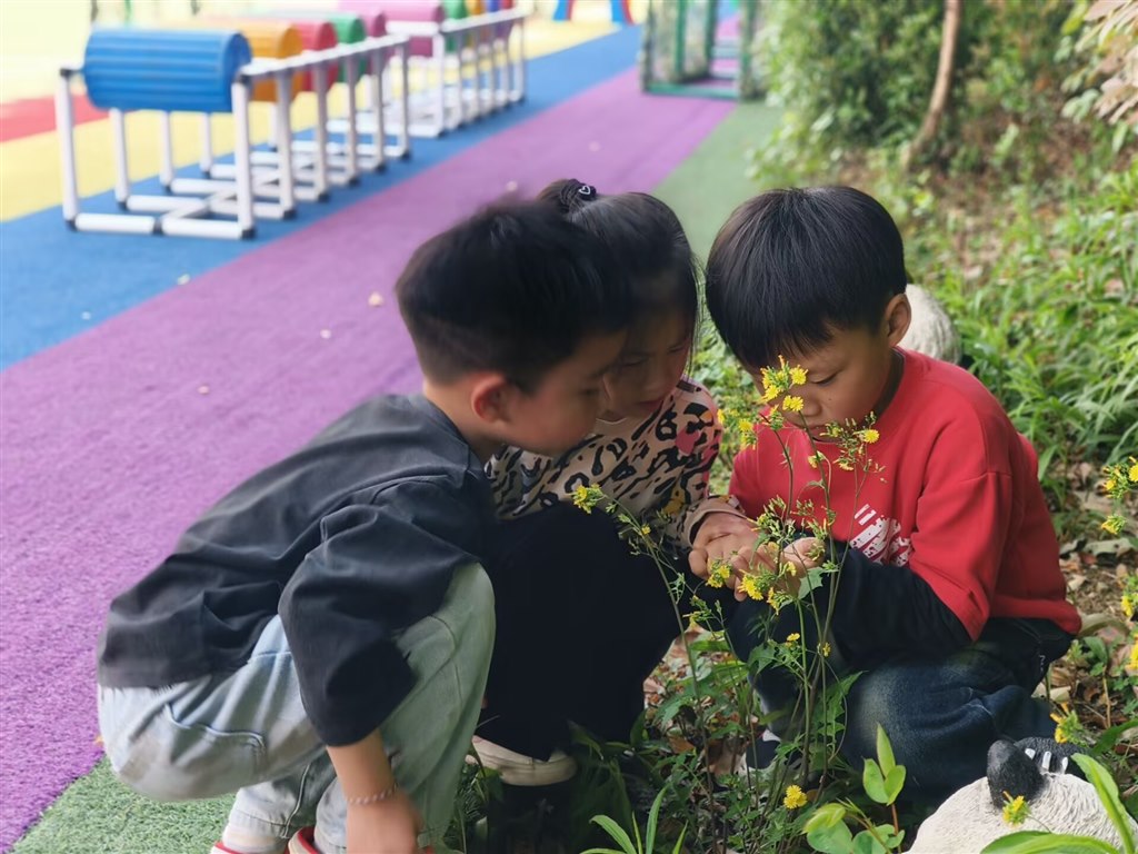 走出教室,孩子们化身“小小探险家”,在幼儿园的角落寻觅春天的踪迹。他们蹲在花丛边,仔细观察嫩黄的小花,凑近闻一闻春日的芬芳,用小手轻轻触摸柔软的花瓣,在自然中解锁春天的密码,感受生命的蓬勃与美好。