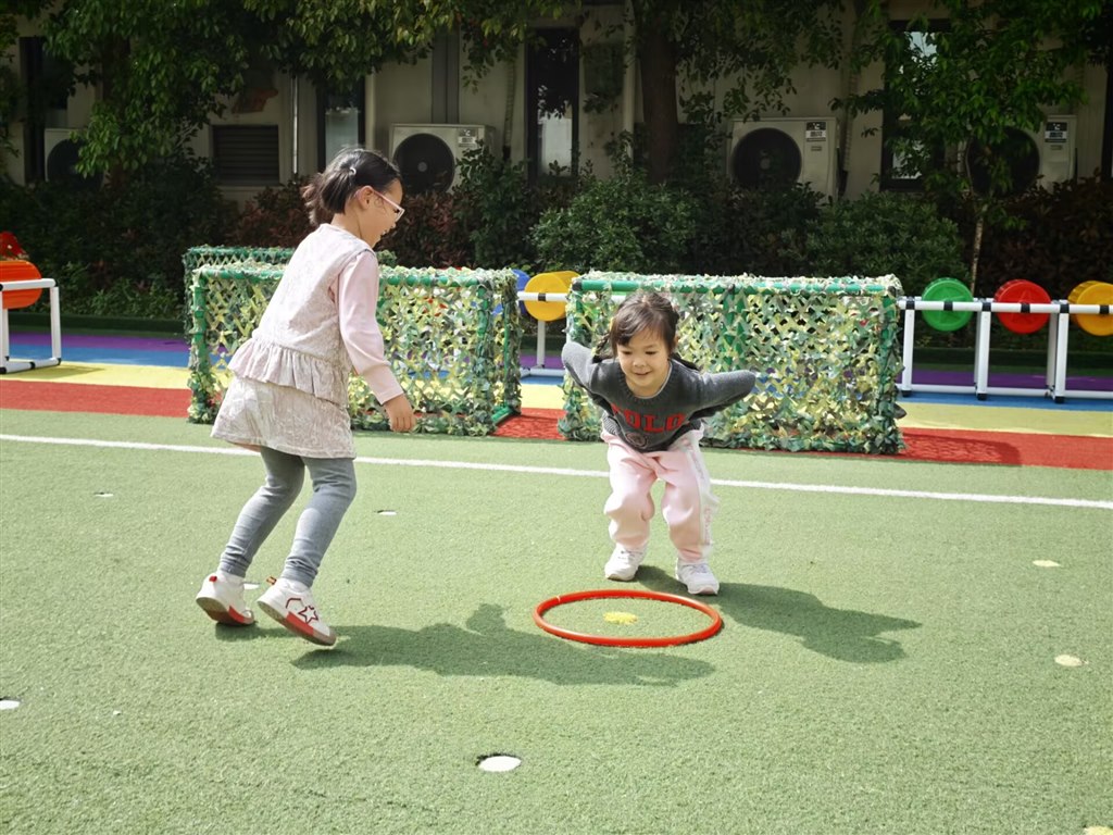 活动现场,彩色呼啦圈错落摆放,教师鼓励幼儿自主探索玩法。孩子们化身运动小达人,解锁单人双脚跳、单脚跳、开合跳等基础技能,还大胆尝试合作连环跳、接力跳圈等趣味挑战。大家在跳跃中舒展身体,在协作中互帮互助,尽情享受运动的快乐,清脆的笑声回荡在校园操场。