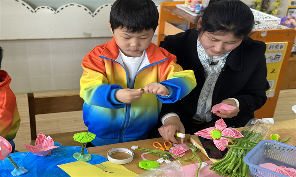 活动伊始,孩子们在老师的带领下,走进了精彩的综合活动《我也要搭车》。课堂上,教师以生动的绘本故事为切入点,巧妙引导幼儿模仿动物对话,鼓励他们大胆清晰地描述动物特征,孩子们在一问一答中积极互动,不仅锻炼了语言表达能力,还在游戏中直观感知了数量与乘车的关系。随后,温馨的亲子手工环节——“创意百变工坊”温情开启。在家长的陪伴下,孩子们化身小小艺术家,共同制作荷花主题亲子手工活动。活动中,家长与幼儿分组协作,或用超轻粘土精心塑造荷花与荷叶,或利用剪纸、拓印等方式创作莲藕画。大家专注眼神、默契配合,一张张精美的荷塘作品在指尖诞生。当所有作品汇聚成“创意荷塘大合集”时,孩子们脸上洋溢着自豪与喜悦,亲子间的爱意在欢声笑语中流淌。